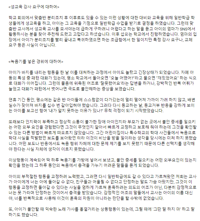 현재 자신과 자신의 아들을 둘러싼 논란이 점차 커지자 주호민은 자신의 유튜브 채널 커뮤니티를 통하여 자신의 입장을 밝혔습니다. 입장문에서는 같은 반 친구들과 학부모, 모든 특수교사, 발달 장애 아동 부모 등에게 사과하였으며 성교육 강사 섭외, 녹음기에 대한 오해에 대한 입장을 밝혔습니다.