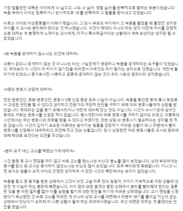 7일 사건을 맡고 있는 수원지법 등에 따르면 주호민 작가의 변호를 맡고 있던 법무법인 소속 변호인 전원이 8월 2일에 돌연 사임계를 제출했다고 합니다. 사임에 대한 정확한 이유는 밝혀지지 않았으나 변호인단은 사건을 검토하고 난 이후 돌연 사임을 결정했다고 합니다. 실제 제출된 녹음본을 분석한 나사렛대 특수교육과 류재연 교수는 녹취록 전체를 공개하라며 전체가 공개되는 순간 해당 교사에게 여론이 돌아설 것이라고 말하였습니다.