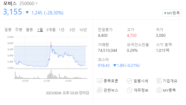 모비스는 지난 2일까지 상한가로 마감하였으며 초전도체의 진위여부를 둘러싼 여러 기사들로 인하여 폭락하고 있습니다.